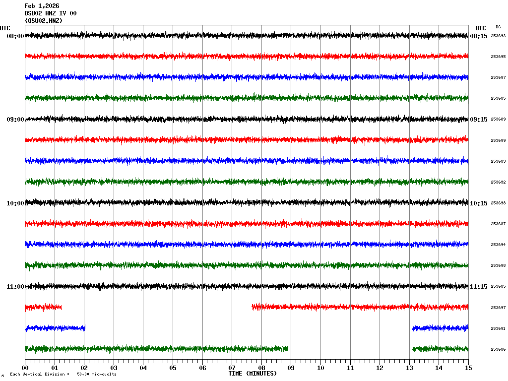 In questa pagina sono visualizzate le tracce delle componenti verticali registrate nelle ultime 24 ore ad alcune stazioni sismiche OSU-CT, ubicate (vedi mappa) nell'area del centro storico di Catania. HNZ indica la componente verticale dell'accelerometro mentre EHZ la componente verticale del velocimetro. In ogni schermata sono rappresentate 4 ore di registrazione. Le schermate corrispondenti alle diverse fasce orarie possono essere selezionate dalla tabella riportata in alto. Ogni riga rappresenta 15 minuti di registrazione e ogni minuto è separato dalle linee verticali. Gli orari sono espressi in UTC. Pertanto per ottenere l'ora locale occorre aggiungere 1 ora quando è in vigore l'ora solare o 2 ore quando è in vigore l'ora legale.
