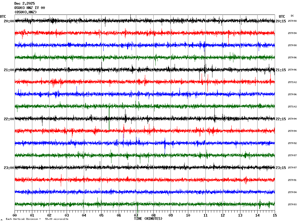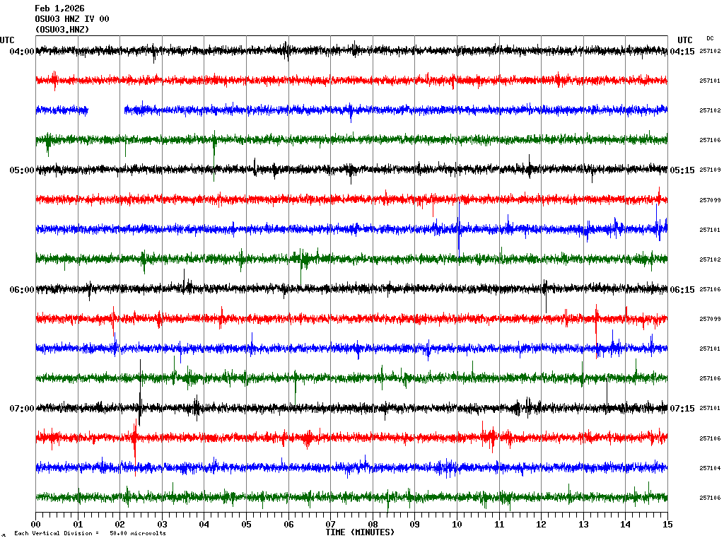 In questa pagina sono visualizzate le tracce delle componenti verticali registrate nelle ultime 24 ore ad alcune stazioni sismiche OSU-CT, ubicate (vedi mappa) nell'area del centro storico di Catania. HNZ indica la componente verticale dell'accelerometro mentre EHZ la componente verticale del velocimetro. In ogni schermata sono rappresentate 4 ore di registrazione. Le schermate corrispondenti alle diverse fasce orarie possono essere selezionate dalla tabella riportata in alto. Ogni riga rappresenta 15 minuti di registrazione e ogni minuto è separato dalle linee verticali. Gli orari sono espressi in UTC. Pertanto per ottenere l'ora locale occorre aggiungere 1 ora quando è in vigore l'ora solare o 2 ore quando è in vigore l'ora legale.
