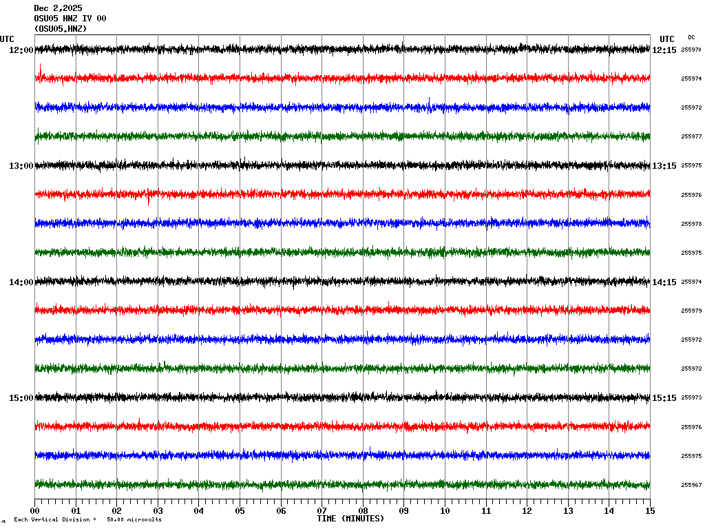 In questa pagina sono visualizzate le tracce delle componenti verticali registrate nelle ultime 24 ore ad alcune stazioni sismiche OSU-CT, ubicate (vedi mappa) nell'area del centro storico di Catania. HNZ indica la componente verticale dell'accelerometro mentre EHZ la componente verticale del velocimetro. In ogni schermata sono rappresentate 4 ore di registrazione. Le schermate corrispondenti alle diverse fasce orarie possono essere selezionate dalla tabella riportata in alto. Ogni riga rappresenta 15 minuti di registrazione e ogni minuto è separato dalle linee verticali. Gli orari sono espressi in UTC. Pertanto per ottenere l'ora locale occorre aggiungere 1 ora quando è in vigore l'ora solare o 2 ore quando è in vigore l'ora legale.