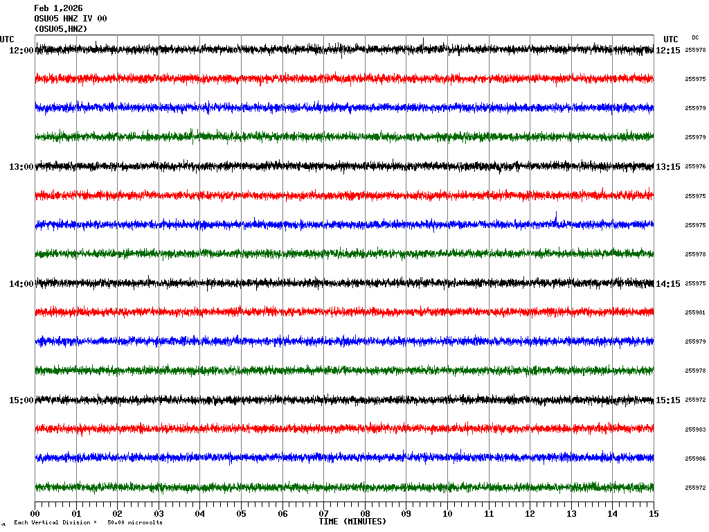 In questa pagina sono visualizzate le tracce delle componenti verticali registrate nelle ultime 24 ore ad alcune stazioni sismiche OSU-CT, ubicate (vedi mappa) nell'area del centro storico di Catania. HNZ indica la componente verticale dell'accelerometro mentre EHZ la componente verticale del velocimetro. In ogni schermata sono rappresentate 4 ore di registrazione. Le schermate corrispondenti alle diverse fasce orarie possono essere selezionate dalla tabella riportata in alto. Ogni riga rappresenta 15 minuti di registrazione e ogni minuto è separato dalle linee verticali. Gli orari sono espressi in UTC. Pertanto per ottenere l'ora locale occorre aggiungere 1 ora quando è in vigore l'ora solare o 2 ore quando è in vigore l'ora legale.