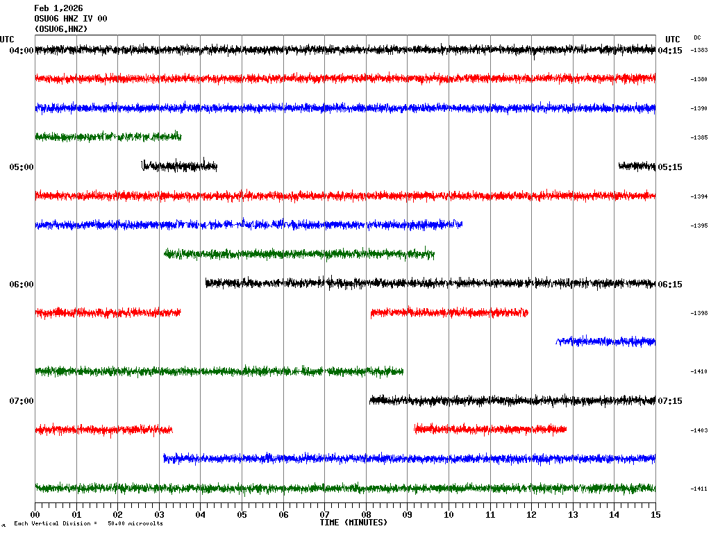 In questa pagina sono visualizzate le tracce delle componenti verticali registrate nelle ultime 24 ore ad alcune stazioni sismiche OSU-CT, ubicate (vedi mappa) nell'area del centro storico di Catania. HNZ indica la componente verticale dell'accelerometro mentre EHZ la componente verticale del velocimetro. In ogni schermata sono rappresentate 4 ore di registrazione. Le schermate corrispondenti alle diverse fasce orarie possono essere selezionate dalla tabella riportata in alto. Ogni riga rappresenta 15 minuti di registrazione e ogni minuto è separato dalle linee verticali. Gli orari sono espressi in UTC. Pertanto per ottenere l'ora locale occorre aggiungere 1 ora quando è in vigore l'ora solare o 2 ore quando è in vigore l'ora legale.