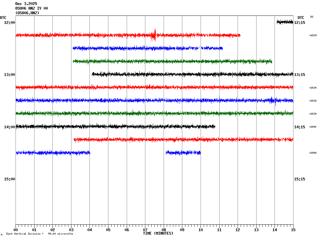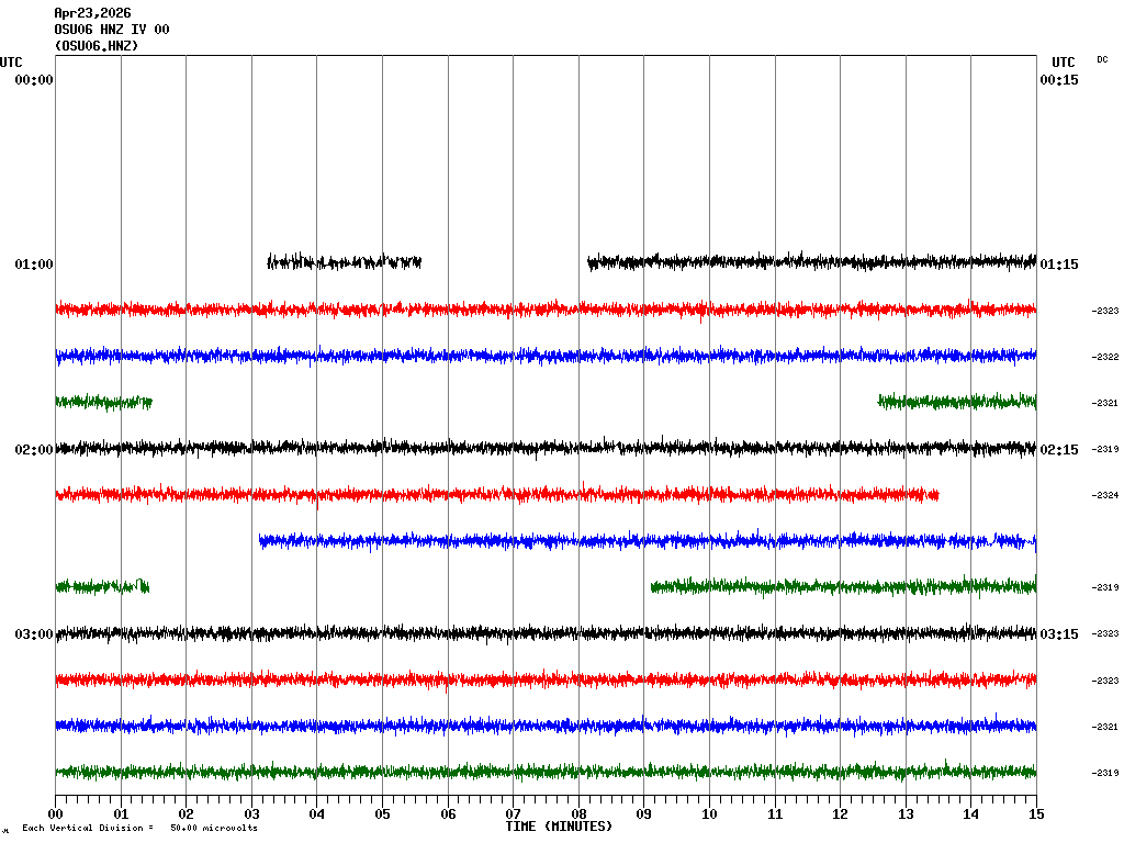 In questa pagina sono visualizzate le tracce delle componenti verticali registrate nelle ultime 24 ore ad alcune stazioni sismiche OSU-CT, ubicate (vedi mappa) nell'area del centro storico di Catania. HNZ indica la componente verticale dell'accelerometro mentre EHZ la componente verticale del velocimetro. In ogni schermata sono rappresentate 4 ore di registrazione. Le schermate corrispondenti alle diverse fasce orarie possono essere selezionate dalla tabella riportata in alto. Ogni riga rappresenta 15 minuti di registrazione e ogni minuto è separato dalle linee verticali. Gli orari sono espressi in UTC. Pertanto per ottenere l'ora locale occorre aggiungere 1 ora quando è in vigore l'ora solare o 2 ore quando è in vigore l'ora legale.
