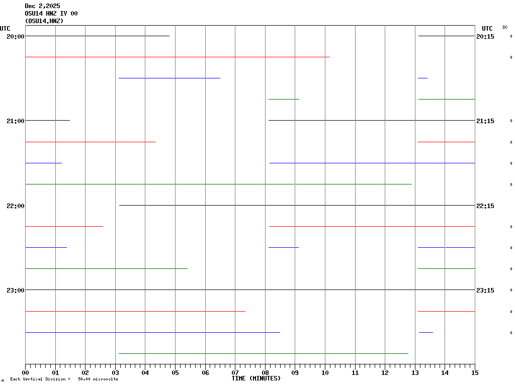 In questa pagina sono visualizzate le tracce delle componenti verticali registrate nelle ultime 24 ore ad alcune stazioni sismiche OSU-CT, ubicate (vedi mappa) nell'area del centro storico di Catania. HNZ indica la componente verticale dell'accelerometro mentre EHZ la componente verticale del velocimetro. In ogni schermata sono rappresentate 4 ore di registrazione. Le schermate corrispondenti alle diverse fasce orarie possono essere selezionate dalla tabella riportata in alto. Ogni riga rappresenta 15 minuti di registrazione e ogni minuto è separato dalle linee verticali. Gli orari sono espressi in UTC. Pertanto per ottenere l'ora locale occorre aggiungere 1 ora quando è in vigore l'ora solare o 2 ore quando è in vigore l'ora legale.
