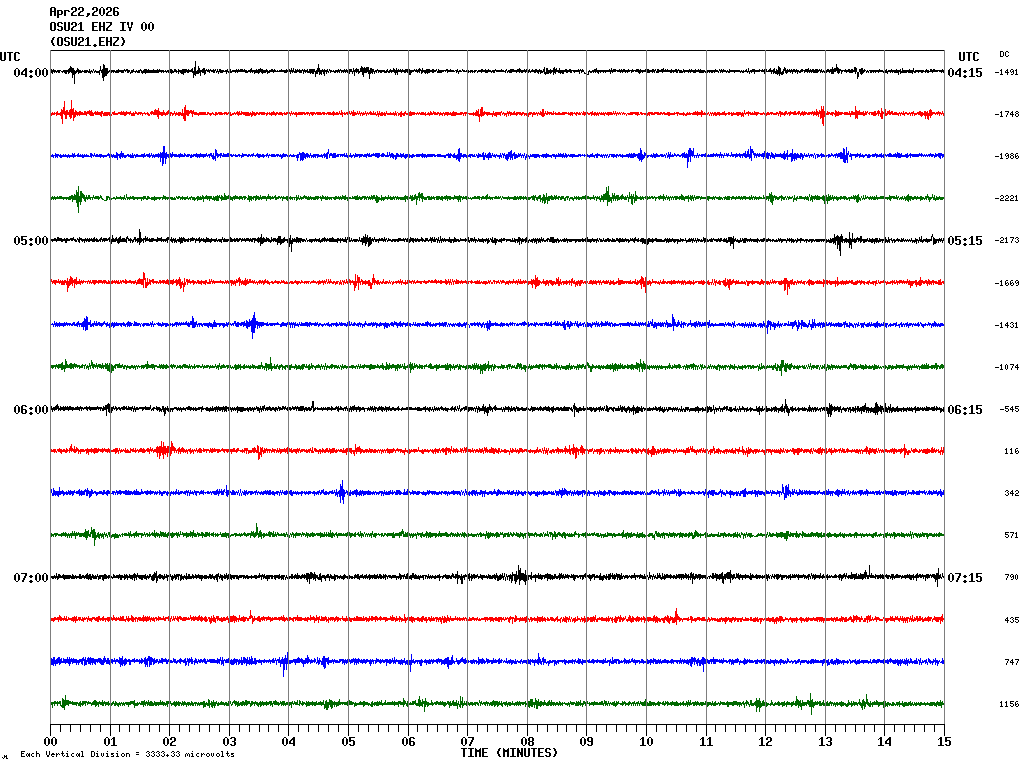 In questa pagina sono visualizzate le tracce delle componenti verticali registrate nelle ultime 24 ore ad alcune stazioni sismiche OSU-CT, ubicate (vedi mappa) nell'area del centro storico di Catania. HNZ indica la componente verticale dell'accelerometro mentre EHZ la componente verticale del velocimetro. In ogni schermata sono rappresentate 4 ore di registrazione. Le schermate corrispondenti alle diverse fasce orarie possono essere selezionate dalla tabella riportata in alto. Ogni riga rappresenta 15 minuti di registrazione e ogni minuto è separato dalle linee verticali. Gli orari sono espressi in UTC. Pertanto per ottenere l'ora locale occorre aggiungere 1 ora quando è in vigore l'ora solare o 2 ore quando è in vigore l'ora legale.