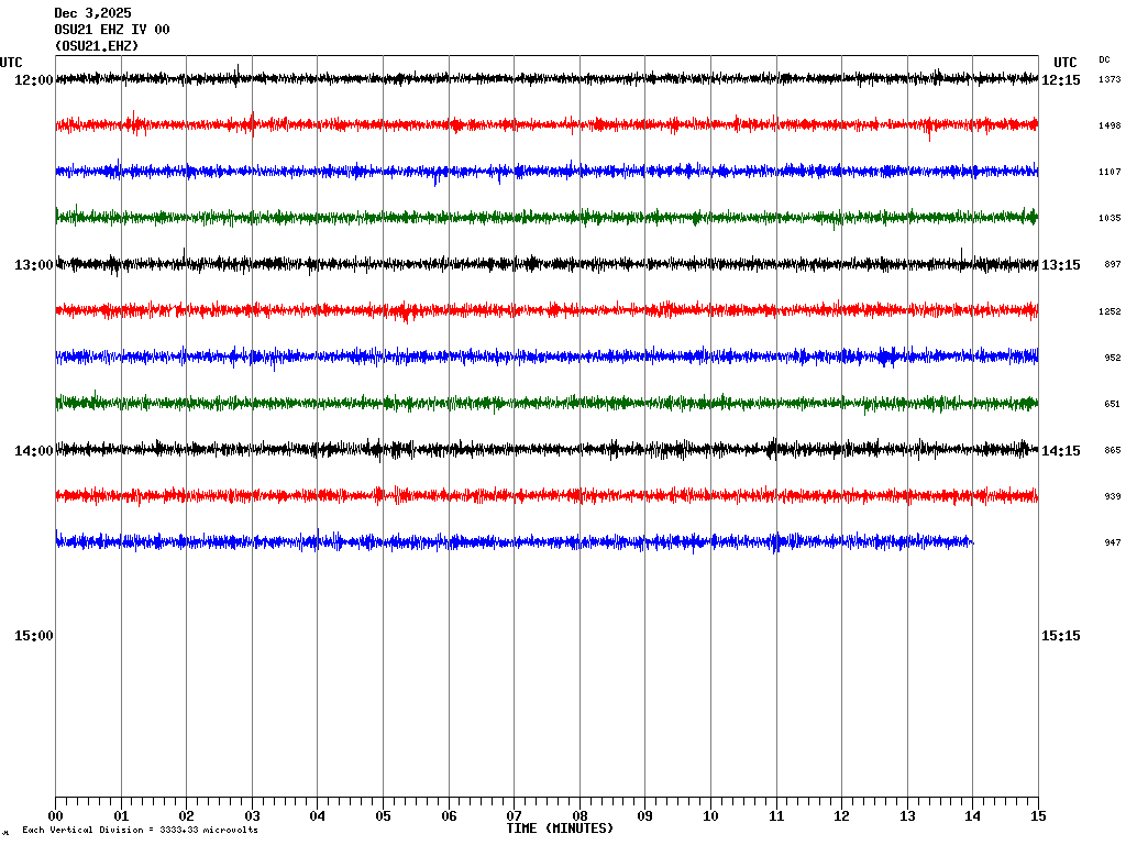 In questa pagina sono visualizzate le tracce delle componenti verticali registrate nelle ultime 24 ore ad alcune stazioni sismiche OSU-CT, ubicate (vedi mappa) nell'area del centro storico di Catania. HNZ indica la componente verticale dell'accelerometro mentre EHZ la componente verticale del velocimetro. In ogni schermata sono rappresentate 4 ore di registrazione. Le schermate corrispondenti alle diverse fasce orarie possono essere selezionate dalla tabella riportata in alto. Ogni riga rappresenta 15 minuti di registrazione e ogni minuto è separato dalle linee verticali. Gli orari sono espressi in UTC. Pertanto per ottenere l'ora locale occorre aggiungere 1 ora quando è in vigore l'ora solare o 2 ore quando è in vigore l'ora legale.