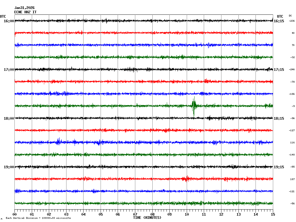In questa pagina sono visualizzate le tracce registrate nelle ultime 24 ore ad alcune stazioni sismiche della rete permanente INGV-OE ubicate nell'area vulcanica etnea e delle Isole Eolie. In ogni schermata sono rappresentate 4 ore di registrazione. Le schermate corrispondenti alle diverse fasce orarie possono essere selezionate dalla tabella riportata in alto. Ogni riga rappresenta 15 minuti di registrazione e ogni minuto è separato dalle linee verticali. Gli orari sono espressi in UTC. Pertanto per ottenere l'ora locale occorre aggiungere 1 ora quando è in vigore l'ora solare o aggiungere 2 ore quando è in vigore l'ora legale.
