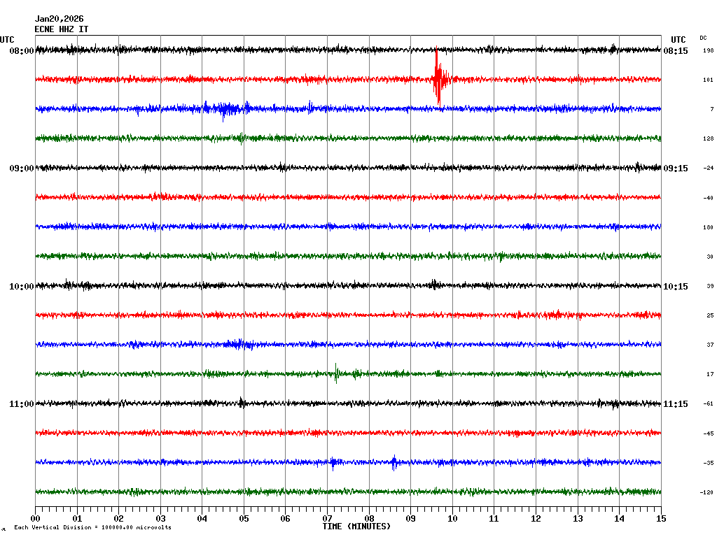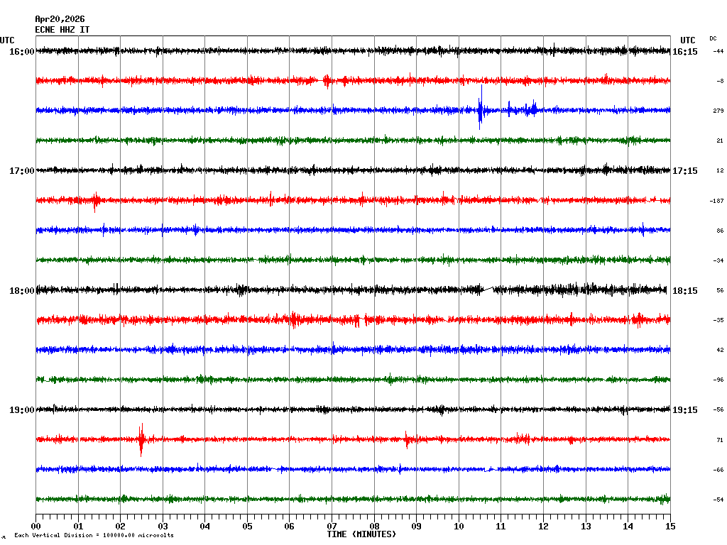 In questa pagina sono visualizzate le tracce registrate nelle ultime 24 ore ad alcune stazioni sismiche della rete permanente INGV-OE ubicate nell'area vulcanica etnea e delle Isole Eolie. In ogni schermata sono rappresentate 4 ore di registrazione. Le schermate corrispondenti alle diverse fasce orarie possono essere selezionate dalla tabella riportata in alto. Ogni riga rappresenta 15 minuti di registrazione e ogni minuto è separato dalle linee verticali. Gli orari sono espressi in UTC. Pertanto per ottenere l'ora locale occorre aggiungere 1 ora quando è in vigore l'ora solare o aggiungere 2 ore quando è in vigore l'ora legale.