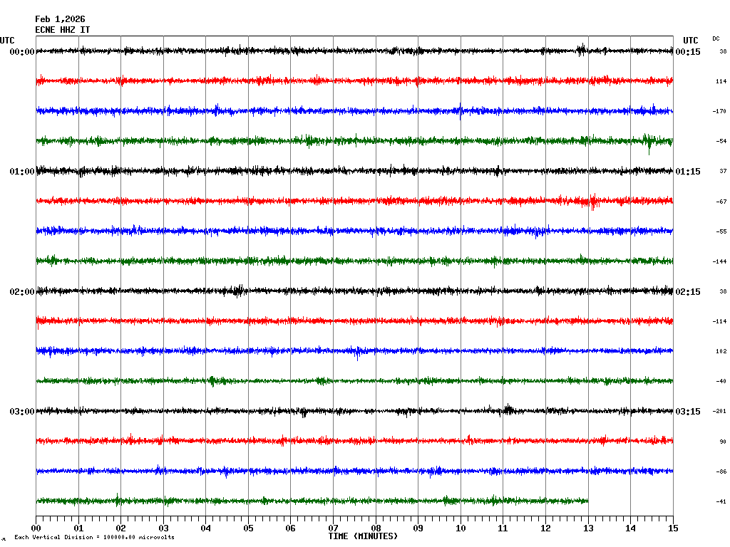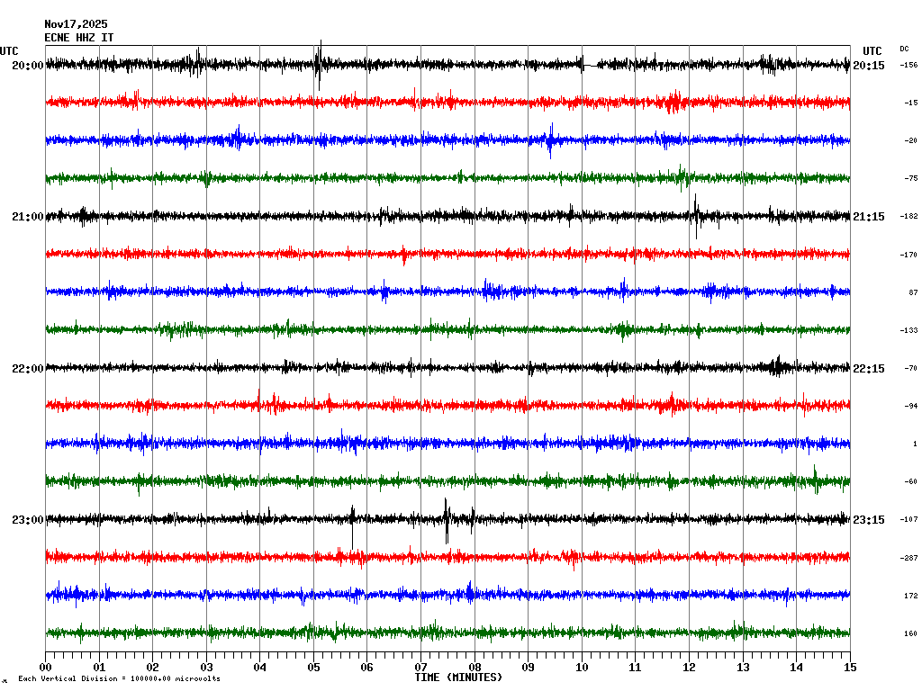 In questa pagina sono visualizzate le tracce registrate nelle ultime 24 ore ad alcune stazioni sismiche della rete permanente INGV-OE ubicate nell'area vulcanica etnea e delle Isole Eolie. In ogni schermata sono rappresentate 4 ore di registrazione. Le schermate corrispondenti alle diverse fasce orarie possono essere selezionate dalla tabella riportata in alto. Ogni riga rappresenta 15 minuti di registrazione e ogni minuto è separato dalle linee verticali. Gli orari sono espressi in UTC. Pertanto per ottenere l'ora locale occorre aggiungere 1 ora quando è in vigore l'ora solare o aggiungere 2 ore quando è in vigore l'ora legale.