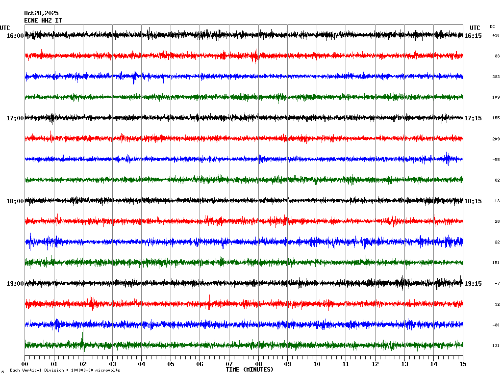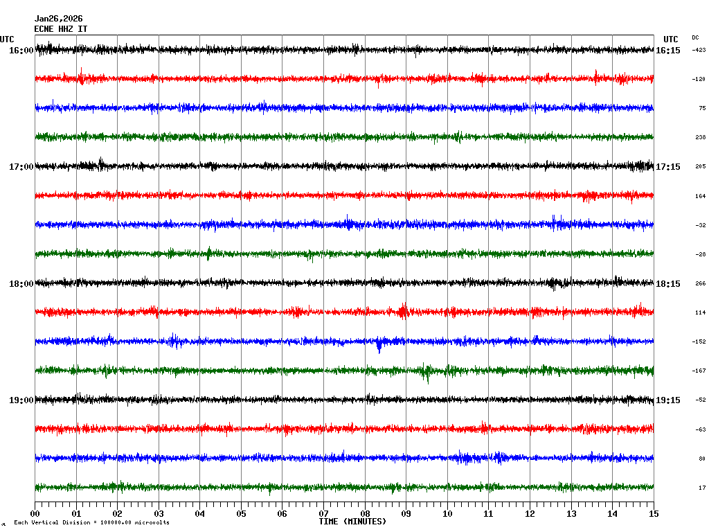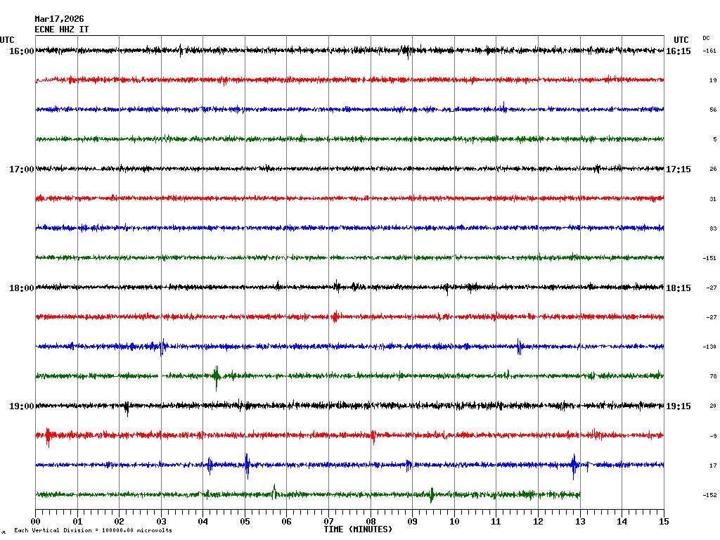In questa pagina sono visualizzate le tracce registrate nelle ultime 24 ore ad alcune stazioni sismiche della rete permanente INGV-OE ubicate nell'area vulcanica etnea e delle Isole Eolie. In ogni schermata sono rappresentate 4 ore di registrazione. Le schermate corrispondenti alle diverse fasce orarie possono essere selezionate dalla tabella riportata in alto. Ogni riga rappresenta 15 minuti di registrazione e ogni minuto è separato dalle linee verticali. Gli orari sono espressi in UTC. Pertanto per ottenere l'ora locale occorre aggiungere 1 ora quando è in vigore l'ora solare o aggiungere 2 ore quando è in vigore l'ora legale.