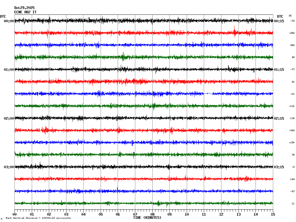 In questa pagina sono visualizzate le tracce registrate nelle ultime 24 ore ad alcune stazioni sismiche della rete permanente INGV-OE ubicate nell'area vulcanica etnea e delle Isole Eolie. In ogni schermata sono rappresentate 4 ore di registrazione. Le schermate corrispondenti alle diverse fasce orarie possono essere selezionate dalla tabella riportata in alto. Ogni riga rappresenta 15 minuti di registrazione e ogni minuto è separato dalle linee verticali. Gli orari sono espressi in UTC. Pertanto per ottenere l'ora locale occorre aggiungere 1 ora quando è in vigore l'ora solare o aggiungere 2 ore quando è in vigore l'ora legale.