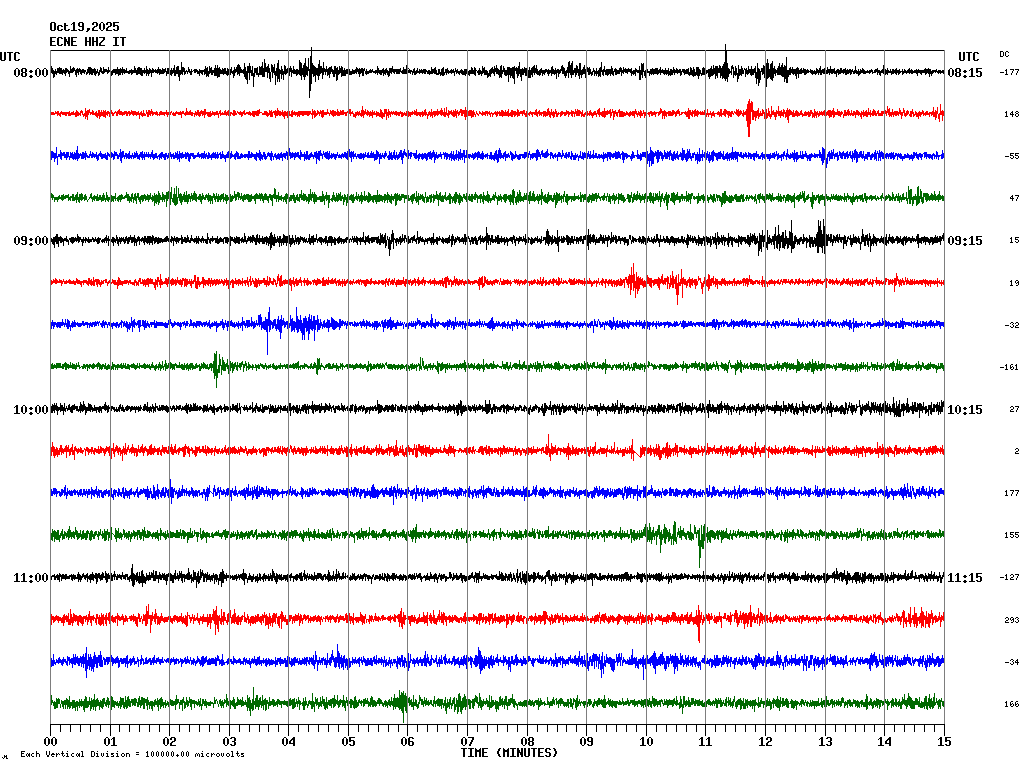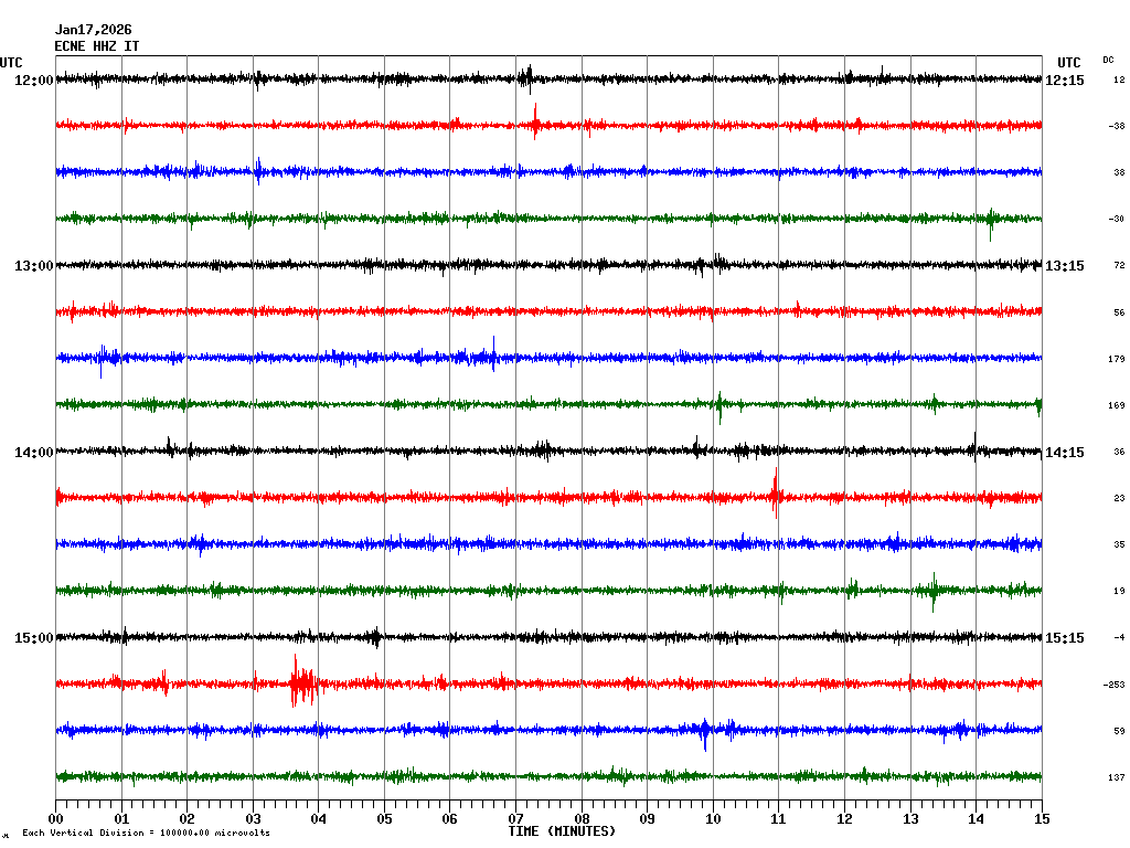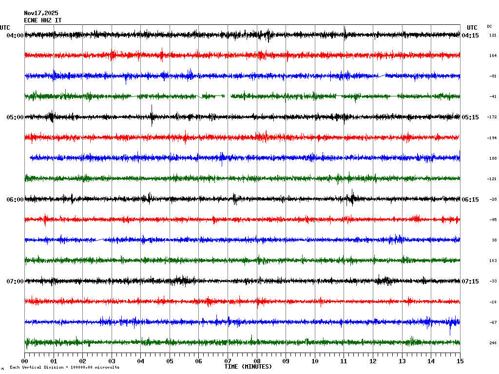 In questa pagina sono visualizzate le tracce registrate nelle ultime 24 ore ad alcune stazioni sismiche della rete permanente INGV-OE ubicate nell'area vulcanica etnea e delle Isole Eolie. In ogni schermata sono rappresentate 4 ore di registrazione. Le schermate corrispondenti alle diverse fasce orarie possono essere selezionate dalla tabella riportata in alto. Ogni riga rappresenta 15 minuti di registrazione e ogni minuto è separato dalle linee verticali. Gli orari sono espressi in UTC. Pertanto per ottenere l'ora locale occorre aggiungere 1 ora quando è in vigore l'ora solare o aggiungere 2 ore quando è in vigore l'ora legale.