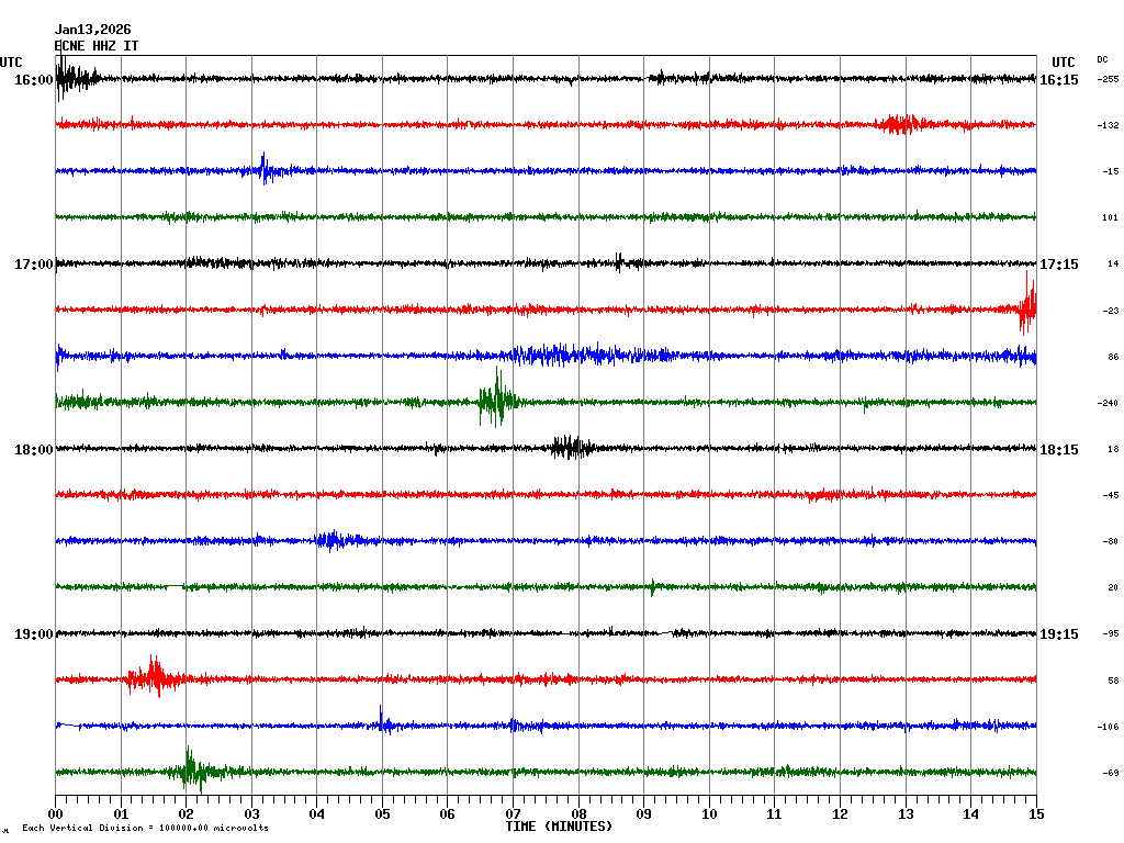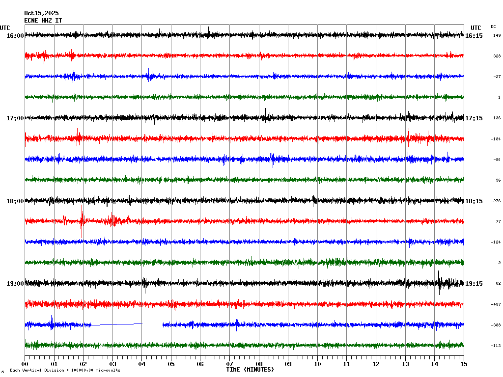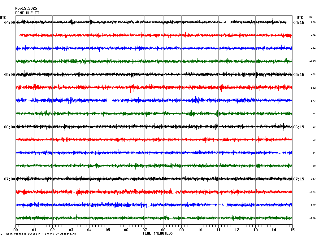 In questa pagina sono visualizzate le tracce registrate nelle ultime 24 ore ad alcune stazioni sismiche della rete permanente INGV-OE ubicate nell'area vulcanica etnea e delle Isole Eolie. In ogni schermata sono rappresentate 4 ore di registrazione. Le schermate corrispondenti alle diverse fasce orarie possono essere selezionate dalla tabella riportata in alto. Ogni riga rappresenta 15 minuti di registrazione e ogni minuto è separato dalle linee verticali. Gli orari sono espressi in UTC. Pertanto per ottenere l'ora locale occorre aggiungere 1 ora quando è in vigore l'ora solare o aggiungere 2 ore quando è in vigore l'ora legale.