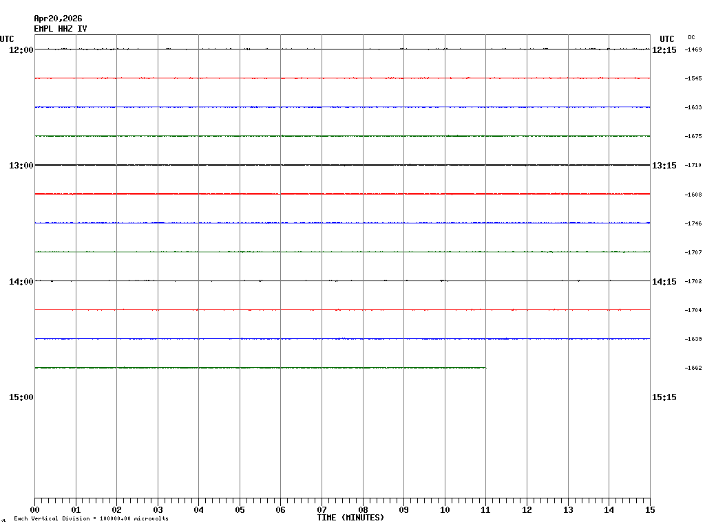 In questa pagina sono visualizzate le tracce registrate nelle ultime 24 ore ad alcune stazioni sismiche della rete permanente INGV-OE ubicate nell'area vulcanica etnea e delle Isole Eolie. In ogni schermata sono rappresentate 4 ore di registrazione. Le schermate corrispondenti alle diverse fasce orarie possono essere selezionate dalla tabella riportata in alto. Ogni riga rappresenta 15 minuti di registrazione e ogni minuto è separato dalle linee verticali. Gli orari sono espressi in UTC. Pertanto per ottenere l'ora locale occorre aggiungere 1 ora quando è in vigore l'ora solare o aggiungere 2 ore quando è in vigore l'ora legale.