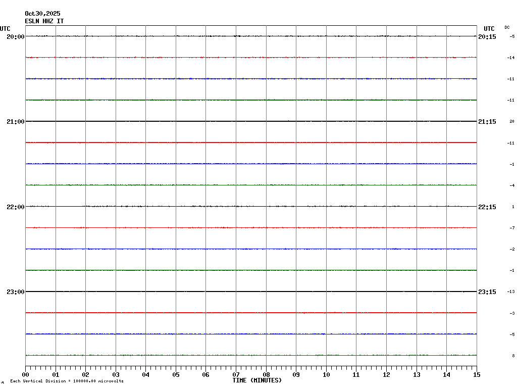 In questa pagina sono visualizzate le tracce registrate nelle ultime 24 ore ad alcune stazioni sismiche della rete permanente INGV-OE ubicate nell'area vulcanica etnea e delle Isole Eolie. In ogni schermata sono rappresentate 4 ore di registrazione. Le schermate corrispondenti alle diverse fasce orarie possono essere selezionate dalla tabella riportata in alto. Ogni riga rappresenta 15 minuti di registrazione e ogni minuto è separato dalle linee verticali. Gli orari sono espressi in UTC. Pertanto per ottenere l'ora locale occorre aggiungere 1 ora quando è in vigore l'ora solare o aggiungere 2 ore quando è in vigore l'ora legale.