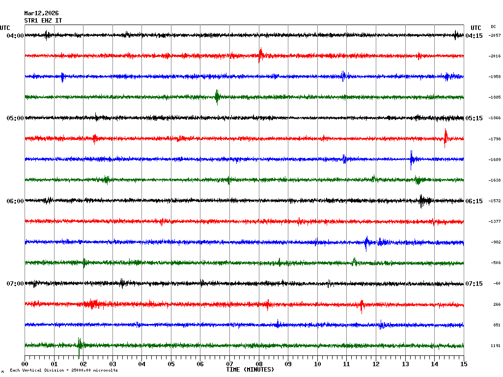 In questa pagina sono visualizzate le tracce registrate nelle ultime 24 ore ad alcune stazioni sismiche della rete permanente INGV-OE ubicate nell'area vulcanica etnea e delle Isole Eolie. In ogni schermata sono rappresentate 4 ore di registrazione. Le schermate corrispondenti alle diverse fasce orarie possono essere selezionate dalla tabella riportata in alto. Ogni riga rappresenta 15 minuti di registrazione e ogni minuto è separato dalle linee verticali. Gli orari sono espressi in UTC. Pertanto per ottenere l'ora locale occorre aggiungere 1 ora quando è in vigore l'ora solare o aggiungere 2 ore quando è in vigore l'ora legale.