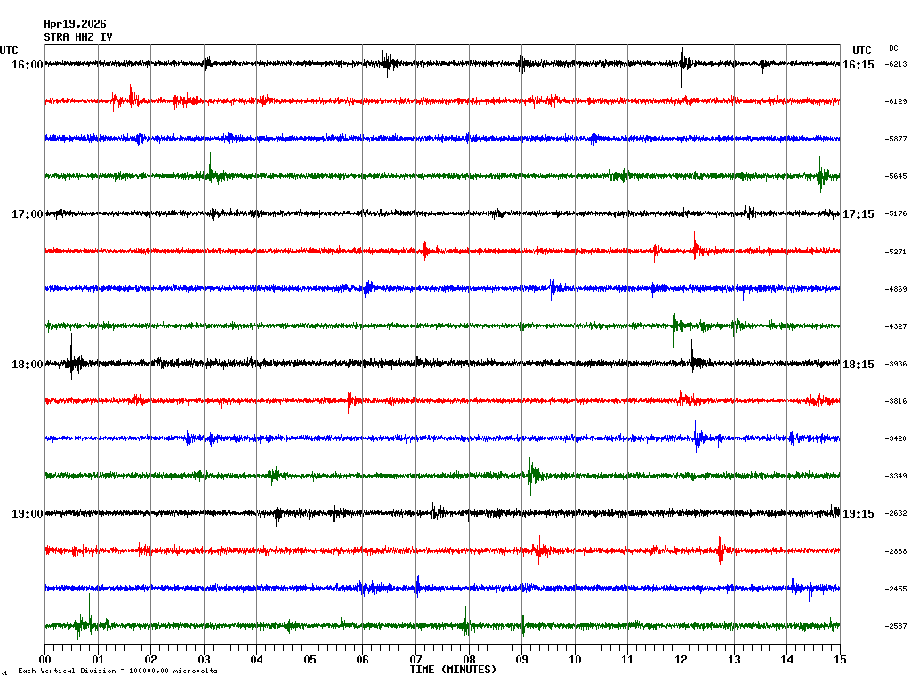 In questa pagina sono visualizzate le tracce registrate nelle ultime 24 ore ad alcune stazioni sismiche della rete permanente INGV-OE ubicate nell'area vulcanica etnea e delle Isole Eolie. In ogni schermata sono rappresentate 4 ore di registrazione. Le schermate corrispondenti alle diverse fasce orarie possono essere selezionate dalla tabella riportata in alto. Ogni riga rappresenta 15 minuti di registrazione e ogni minuto è separato dalle linee verticali. Gli orari sono espressi in UTC. Pertanto per ottenere l'ora locale occorre aggiungere 1 ora quando è in vigore l'ora solare o aggiungere 2 ore quando è in vigore l'ora legale.